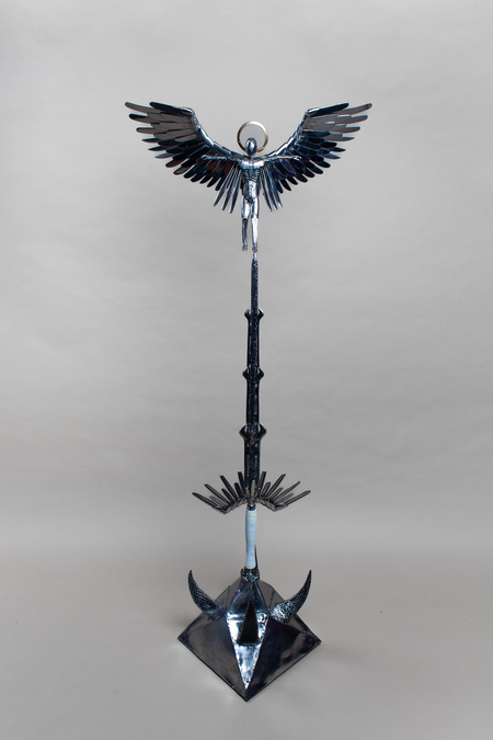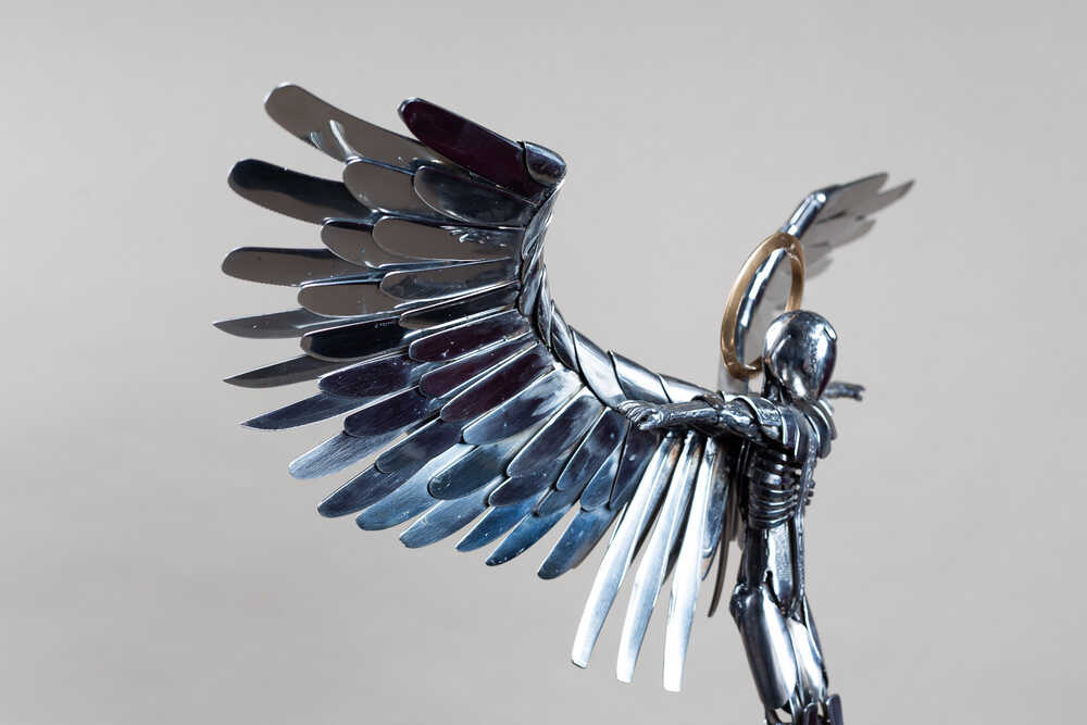 This sculpture is made from recycled cutlery and depicts the archangel Michael with his sword.
