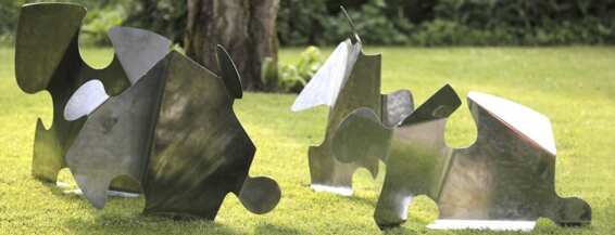 PUZZLED is a sculpture installation of four freestanding, hand formed, stainless steel puzzle-like pieces. This installation serves as an absurd meeting. Fitting in, connection, and reflection. These pieces contemplate the desire to connect and conform.