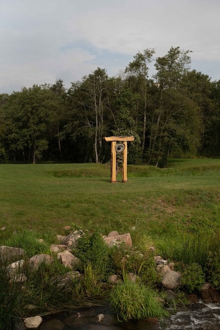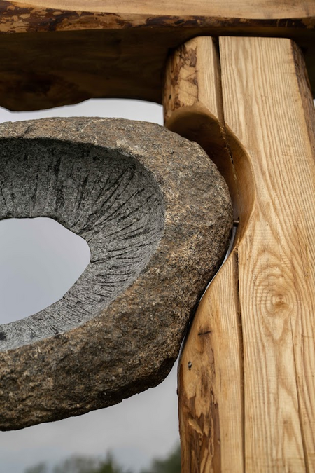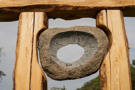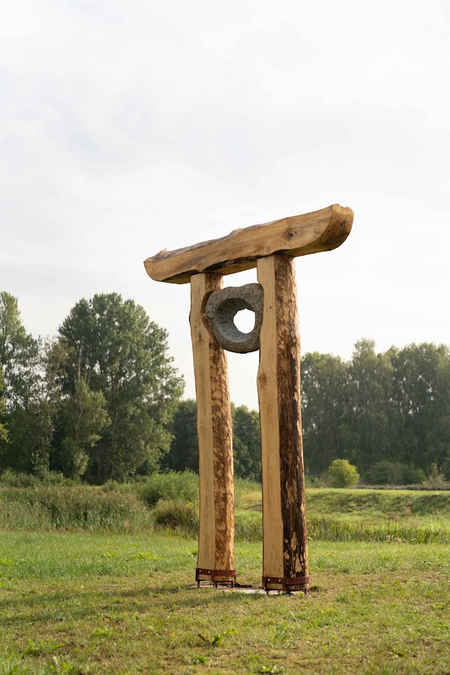 In my sculpture, this idea is metaphorically embodied by a heavy granite disc suspended between two ash tree columns. It is a kind of misunderstanding, a contradiction to the logic offered by materials and to the laws of physics prevailing in nature. The work uses sculptural means to create a strange tension and a sense of anxiety. This sculpture is a kind of gateway, a transit medium that speaks of the act of becoming. What were we like in the past? What are we like today? What will we become in the future? These questions are important in the formation of self-awareness. The sculpture encourages the viewer to ask himself – am I willing to step under the shifting granite full moon in order to move forward, or will I stay where I am?