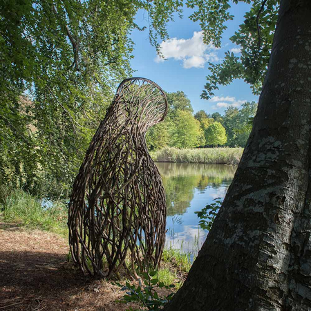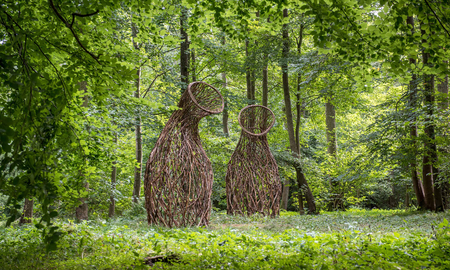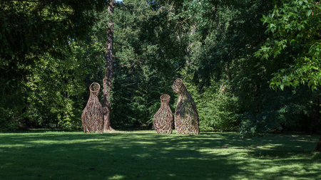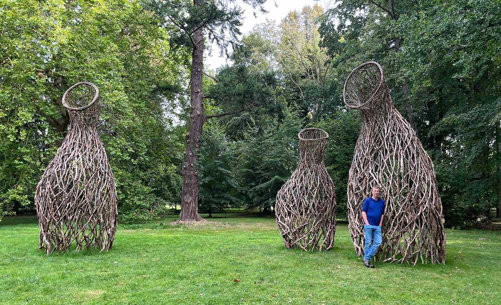 Visitors to Pansevitz Castle Park encounter large, semi-transparent objects at several locations. These structures, composed of dry beech branches loosely assembled into a network, lean toward the viewer—sometimes more, sometimes less.