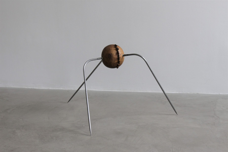 At an altitude of around 400 kilometres, space satellites that are still in operation but that have lost their original purpose a long time ago are orbiting over our heads, awaiting their inevitable demise in the Earth’s atmosphere. Today, there are so many satellites in Earth’s orbit that astronomers struggle to observe more distant celestial bodies – visual pollution makes it difficult to focus the lenses of their telescopes, even though it cannot be seen by the naked eye. Near space is a no man’s land, where all Elon Musks with enough money can throw anything they desire. The irony of my view of this fashion, which was started by the Russians in 1957, is that the satellites depicted here are made of rough, primitive and not even close to cosmic materials, such as wood (wild cherry), iron or concrete. I haven’t exhibited these objects individually – what is important to me is their totality, their interconnection (they are satellites for a reason). Together, these objects function as a single work. I do not rule out the possibility of more of them in the future.