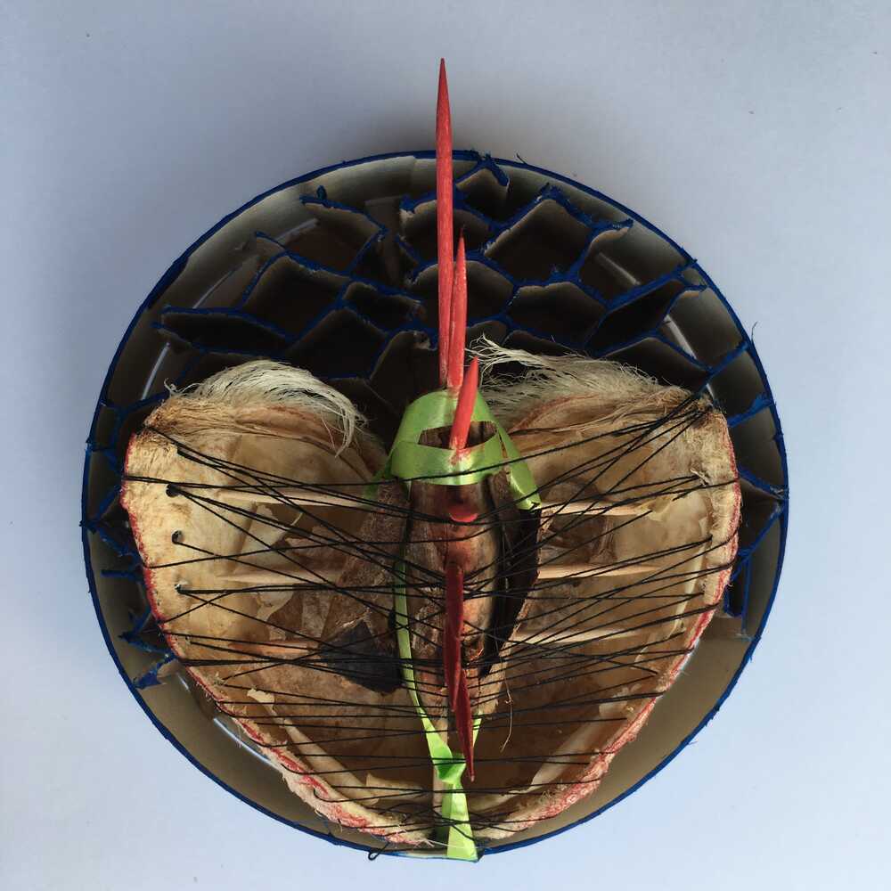 Käseschachtel, Wabenkarton, Mangokern, Farbe, Streichholz, Faden, Packband