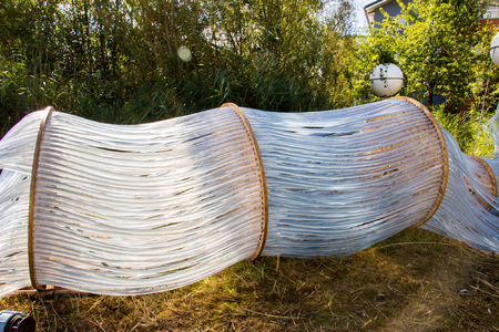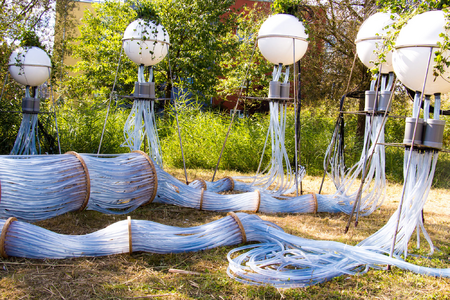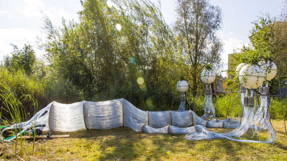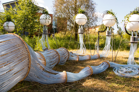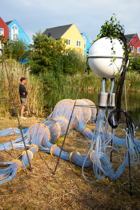 This hydro-sculpture channels water through a network of tubes, delivering nutrients to plants suspended in white spheres. The rhythmic gulp of flowing water and its towering presence create a landscape both familiar and surreal. A fusion of industry and nature, it invites reflection on resilience, fragility, and our connection to the living world.