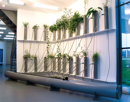 This installation serves as a portrait of the surrounding landscape, where wild plant species, taken from their natural environment by digging them out, are placed in an artificial system called hydroponics. In this system, the plants grow in circulating, nutritious water, expressing the outdoor natural environment in an unexpected context. In the version "Leidsche Rijn", 21 different wild plant species thrived in the hydrosculpture, embodying the local ecosystem.