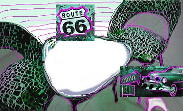 Route 66,  PAL MAL,  Coca Cola,  auf großen Gewebe-Postern am Geländer.