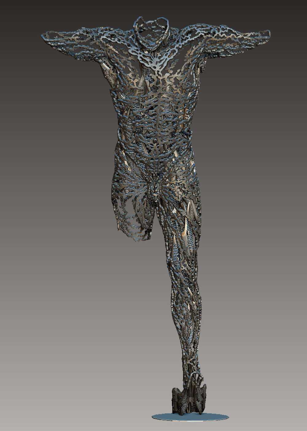 Exploiting the physicality that sculpture furnishes at its’ core; Adrasteo portrays the human form depicted by a lattice curtain, thus allowing the viewer access to the interior cavity of the artwork, and exposing a spiraling structure of both conceptual and mechanical purpose.