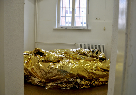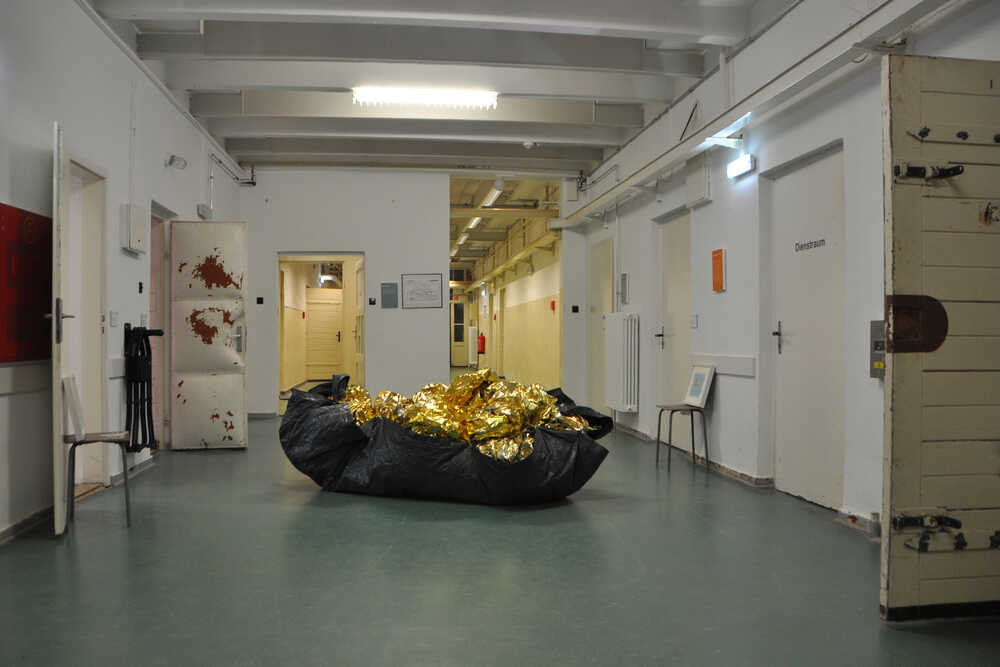 A circle of oversized shirts, crafted from emergency blankets, symbolizes the unity that can connect us as human beings—yet also its fragility. These golden rescue blankets, universal symbols of aid and protection, remind us of the vulnerability of life. Their shine speaks of hope, but also forces us to confront essential questions: