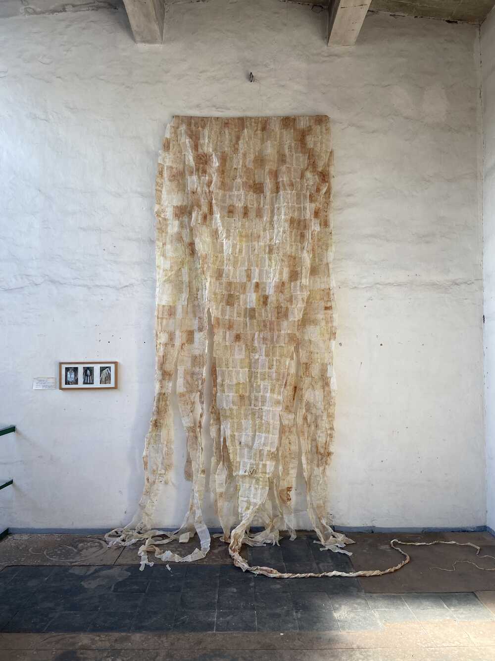 Hanging sculpture, used teabags, starch, fishing line, metal rod, dimensions variable