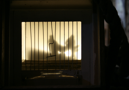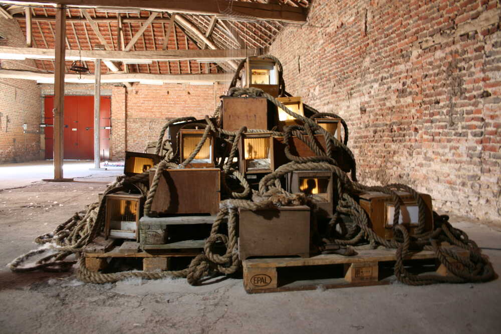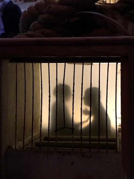 30 Finches cages with silhoutte of refugees and lights located on pallets with ship's ropes.