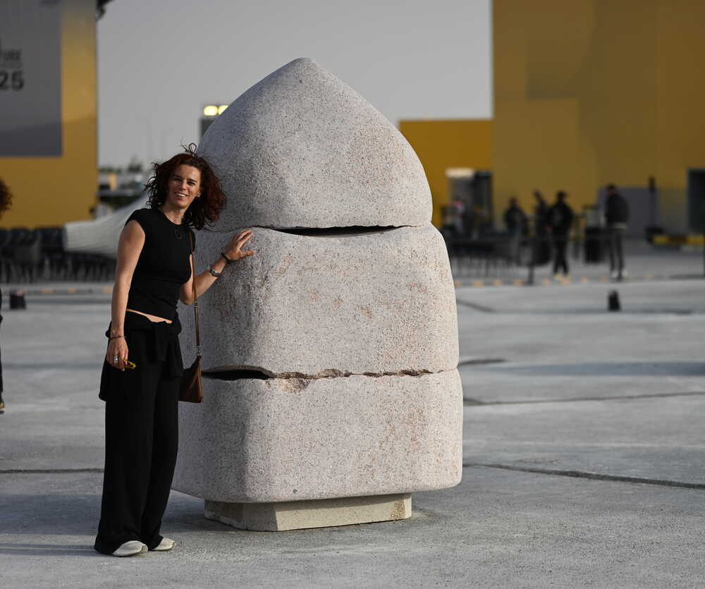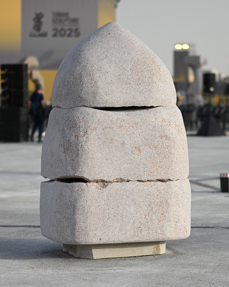 Since the beginning of humanity, the origin of the world has been represented in different cultures as a navel, omphalos, the axis mundi -a cylindrical stone with a pointed end. The act of placing this symbol in a chosen place deified it, positioning it as a core of creation. But in Balance there are three irregular cuts in this form, wich should exists as a harmonious whole. The core has broken into three pieces that do not fit together - a totem of the contemporary era. However, the fresh, pruryfing air that passes between the stone blocks illuminates a possibility of a new future.