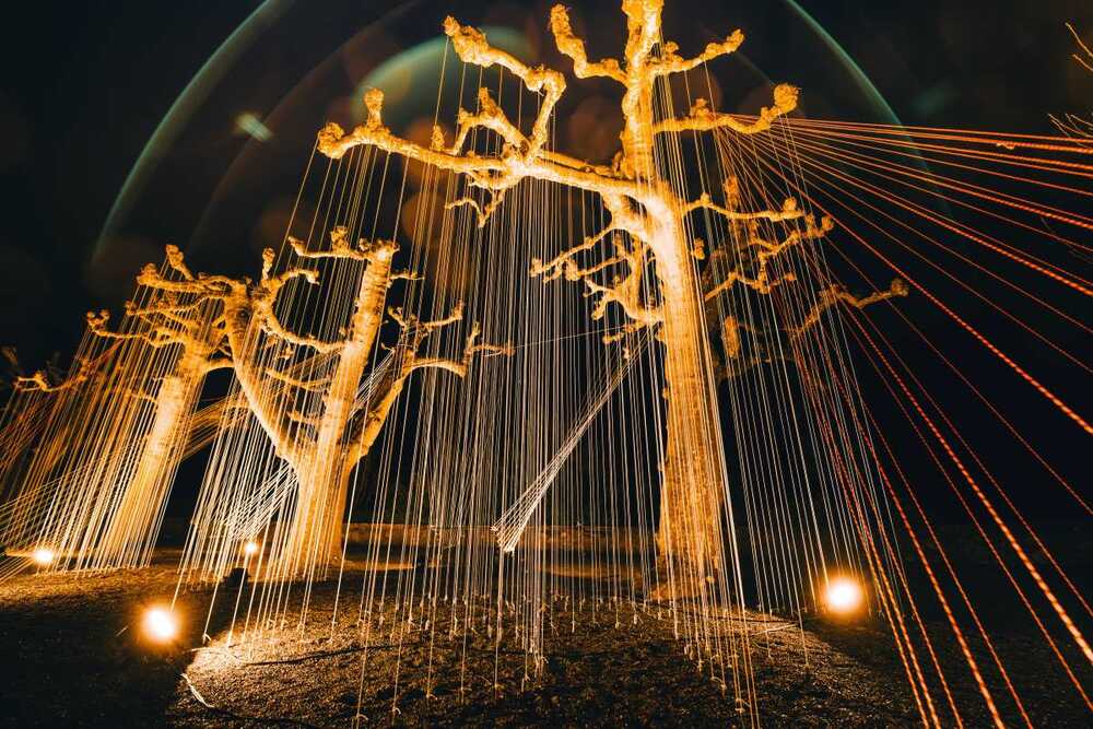 An immersive light installation with many threads in a series of monumental trees behind the French Church in Murten