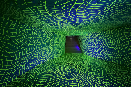 „Unsere Welt ist schön!?“ Zu diesem Thema gestaltete ich den Eingangsbereich der Kunststation Kleinsassen. Knapp 2,5km Klebeband sind verklebt und verformen Boden, Decke und Wände. So unsicher wie die Fragestellung wird hierdurch auch der Zugang in die Ausstellungsräume. Durch den Einsatz von UV Licht, mit Einbruch der Dunkelheit, ist die Verkrümmung des Raumes am intensivsten zu erleben.