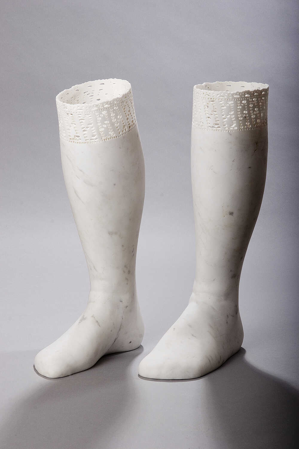 Die Skulptur stellt weiße, historische Strümpfe dar. Der Abdruck von Füßen an den Oberflächen markiert dabei die imaginäre Trägerin. Wie die Momentaufnahme einer Bewegung stehen sie im Raum.