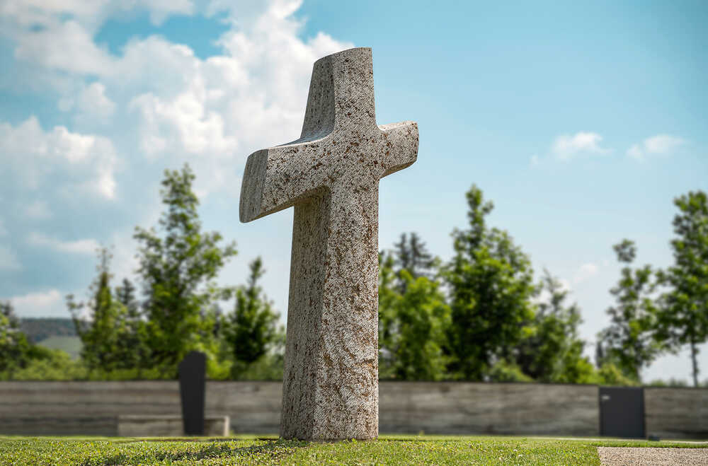 Auf Wunsch der örtlichen Kirchengemeinden sollte das Areal ein christliches Symbol erhalten. Inspiriert von der Wegführung der Urnengrabstätte habe ich eine einladende 2,30 m hohe Kreuzform entworfen - als "freundliches Gegenüber".