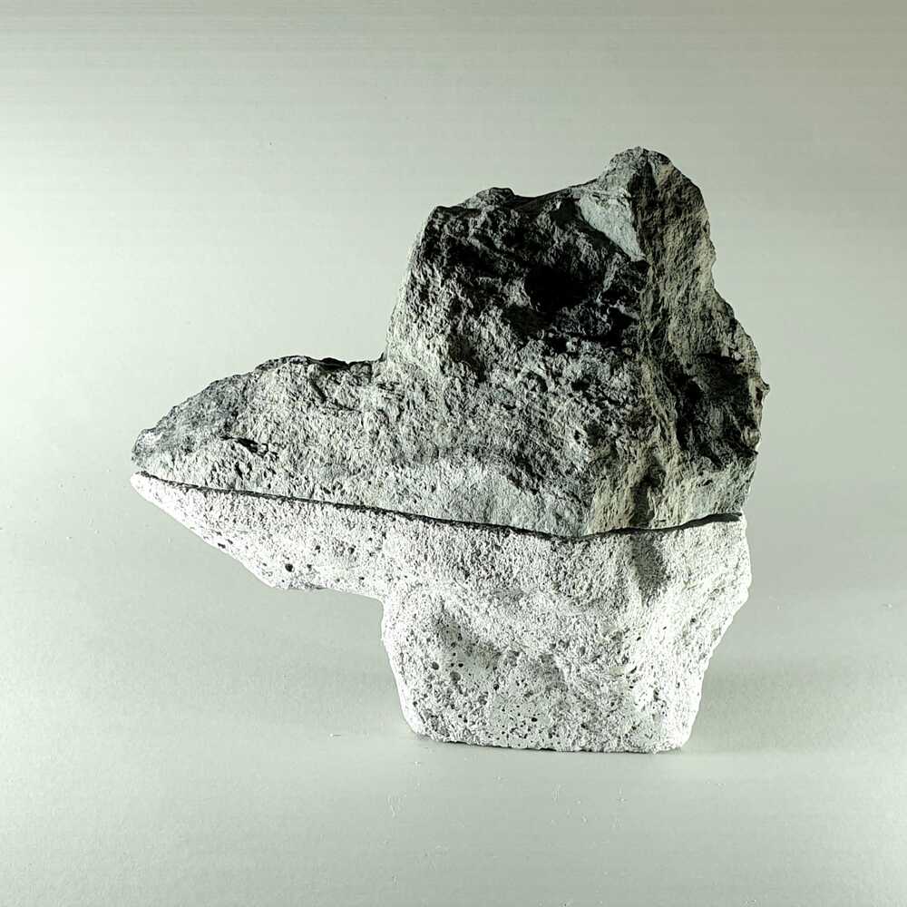 Als Teil meiner Feldforschung zum Cristallina Steinbruch im Vallemaggia/Tessin setzte ich mich während eines dreimonatigen Atelieraufenthalts am Centro Internazionale di Scultura Peccia mit der Situation nach der Flutkatastrophe vom Juni 2024 auseinander. Ich konzentrierte ich mich auf das neu entstandene Flussbett bei Peccia, das mich in seiner dystopischen Anmutung inspirierte. Die erstarrte Situation des gigantischen Flussbetts ohne Wasser galt es für mich in eine künstlerische Form zu übersetzen. Ich sammelte unterschiedliche Flussteine, kappte diese und formte jeweils ein Gegenüber aus Flusssand und Weißzement. Die entstandenen Spiegelungen meiner 17-teiligen Serie „Livello“ imaginieren im Kontrast zur Flutkatastrophe stilles Wasser, wie ein Innehalten danach.