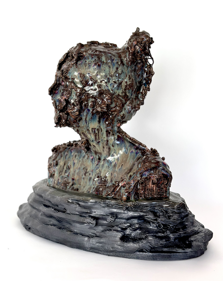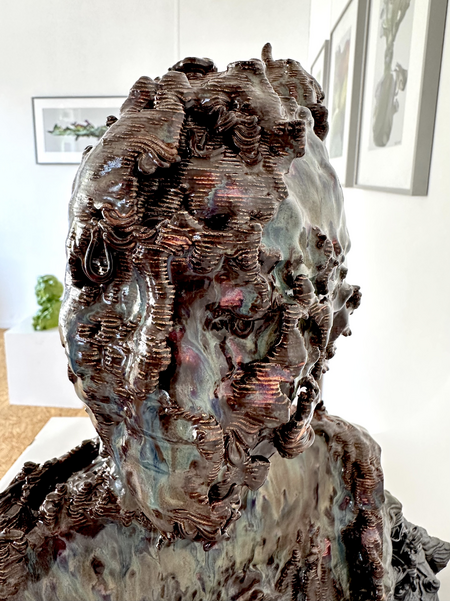 What does a transmedia, hybrid existence do to us? What happens to someone who exists both digitally and physically? How do the different forms of existence relate to each other and how do they influence each other? Questions that are reflected in the creation of the sculpture. Digital, technical and manual processes alternate and relate to each other.
