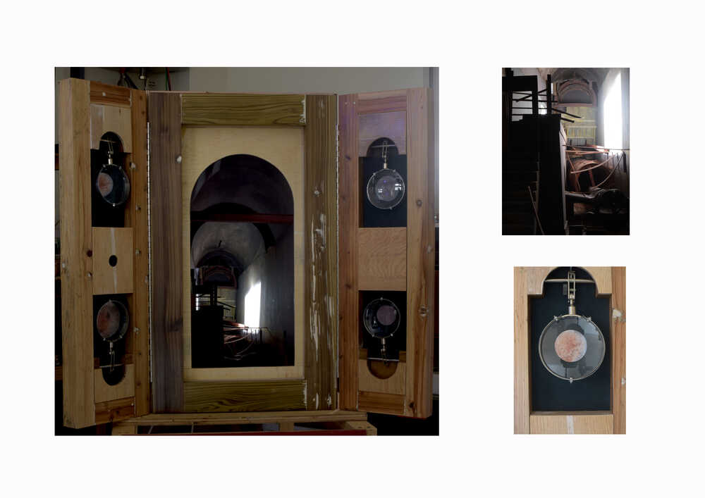 Third in the series of cabinets with triptychs. Along with the cabinets in Tin Gods, this will form part of an installation based on fragments of stories from history, mythology, and science fiction.