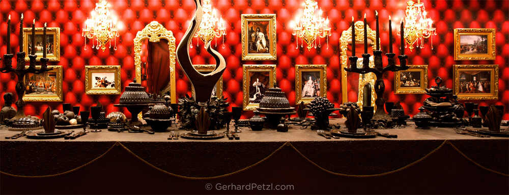 A 5 m long table was set up as a royal feast baroque dinner table, showing cakes, as they looked at that time, parfaits, different breads, fruit stands, various crystal bottles, sugar bowls, a variation of glasses, plates with underliners, folded napkins with embossed logos and cutlery sets with ornaments – all made of chocolate.