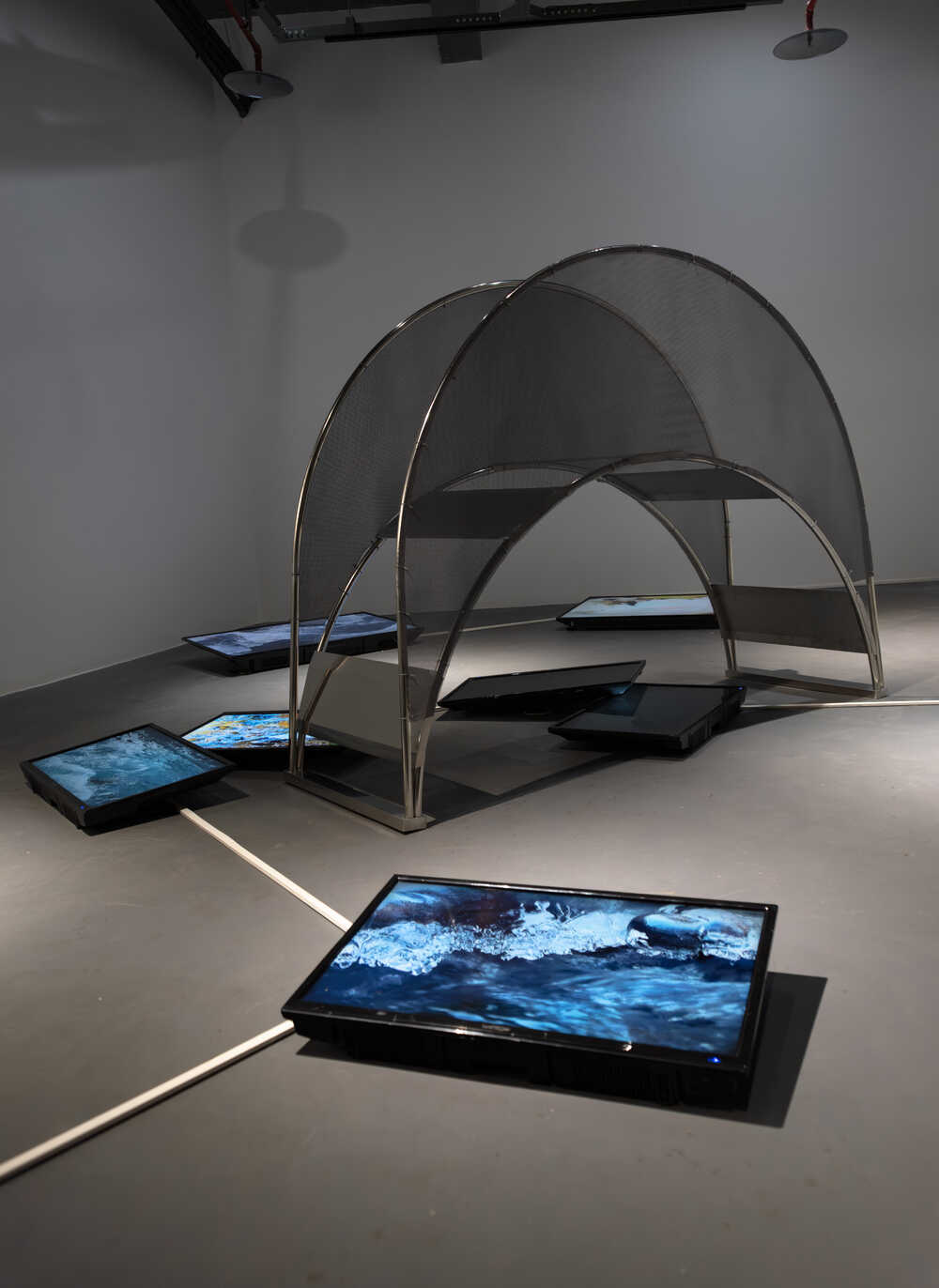 A Bridge to the Landscape featured in SSG’s 2025 solo exhibition, Is The Fake Real, at the 500 m² Yunling Art Centre in Chongqing, China. It consists of screens scattered across the gallery floor, from which the gushing sound of river waters crashing on rocks plays incessantly, only momentarily interrupted when one of the screens briefly blackens as one of the ten videos begins its endless loop once more. The sounds of the turbulent water fill the space, immersing visitors in an intense auditory and visual landscape. At the centre, a steel bridge spans above the screens, uniting the moving images and creating a physical axis through the digital rivers.
