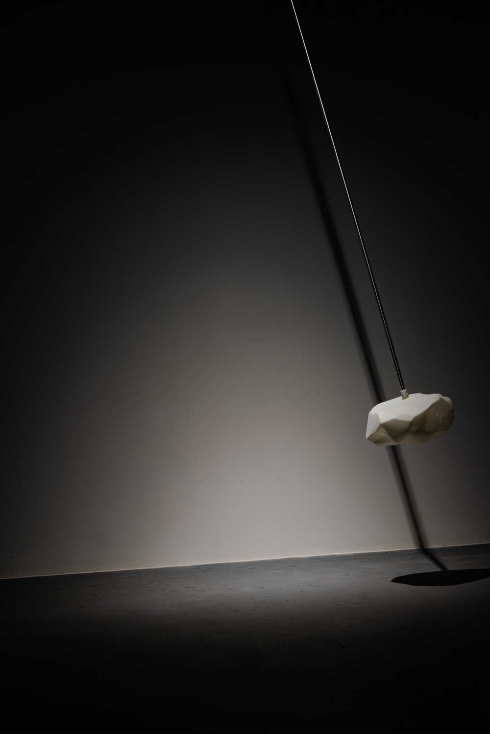 Geological Time enacts a playful yet forced motion that propels us into the lived present. The soft clicks of its stepper motor punctuate the silence, marking moments of rupture and return. A rock-like white resin fragment, suspended from the ceiling, gently oscillates, revealing the passage of its own internal time. What initially appears to be a familiar fragment of landscape gradually discloses difference, exposing overlapping durations and a time that drifts out of joint. As the past pushes into the present, its repetition is ingrained in the shape of the future.
