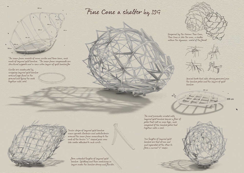 Create a proposed shelter in the forest. SSG's Pine Cone is a schematic that works as both a diagram and image that details the performative creationin bamboo