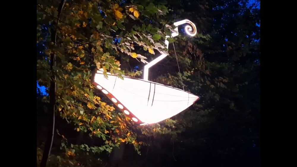 Stell dir vor: Die alte, hölzerne „Harfe der Reise“ steht nicht mehr still. Sie hat sich verwandelt. Der Künstler Franz Görg hat sie in ein gleißendes Lichtschiff getaucht.