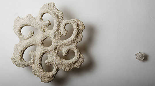 Ein winziges, gehĂ€keltes Spitzendeckchen, dessen Ornamentik an gotische MaĂwerke erinnert, ist in der Umsetzung vergröĂert, wird jedoch durch die OberflĂ€chenstruktur wie unscharf wahrgenommen. HauchdĂŒnn gearbeitet zeigt es die Grenze von Fleiss zum Irrsinn auf.