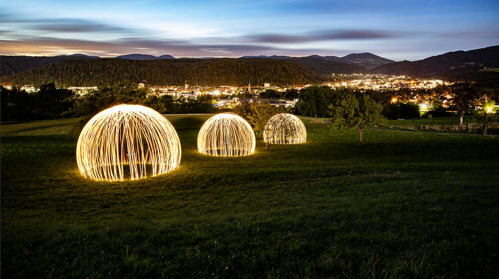 Drei Iglus gebaut aus der Bewegung von Lichtquellen. Langzeitbelichtung.