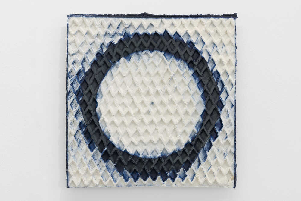 Copying, mimesis, repetition is the essence of our culture. Although the West seeks the utopia of the “unique and original” piece, China clings to the mutable and the process of drift, doing so through shanzai: adapting the copied until it becomes something else. Barreiro deconstructs this ontological framework by turning it on its head: the copy, the serial piece, which can be repeated infinitely, becomes a work of art. He takes traffic signs — arrows, triangles, mandatory rings, warning diagonals — and grafts them onto plaques and volumes worked in white paste. Cobalt oxide — the historic colour of Portugal, of tiles and Vista Alegre — appears in gradients that emerge from the relief: spikes, grooves and meshes that capture the pigment.