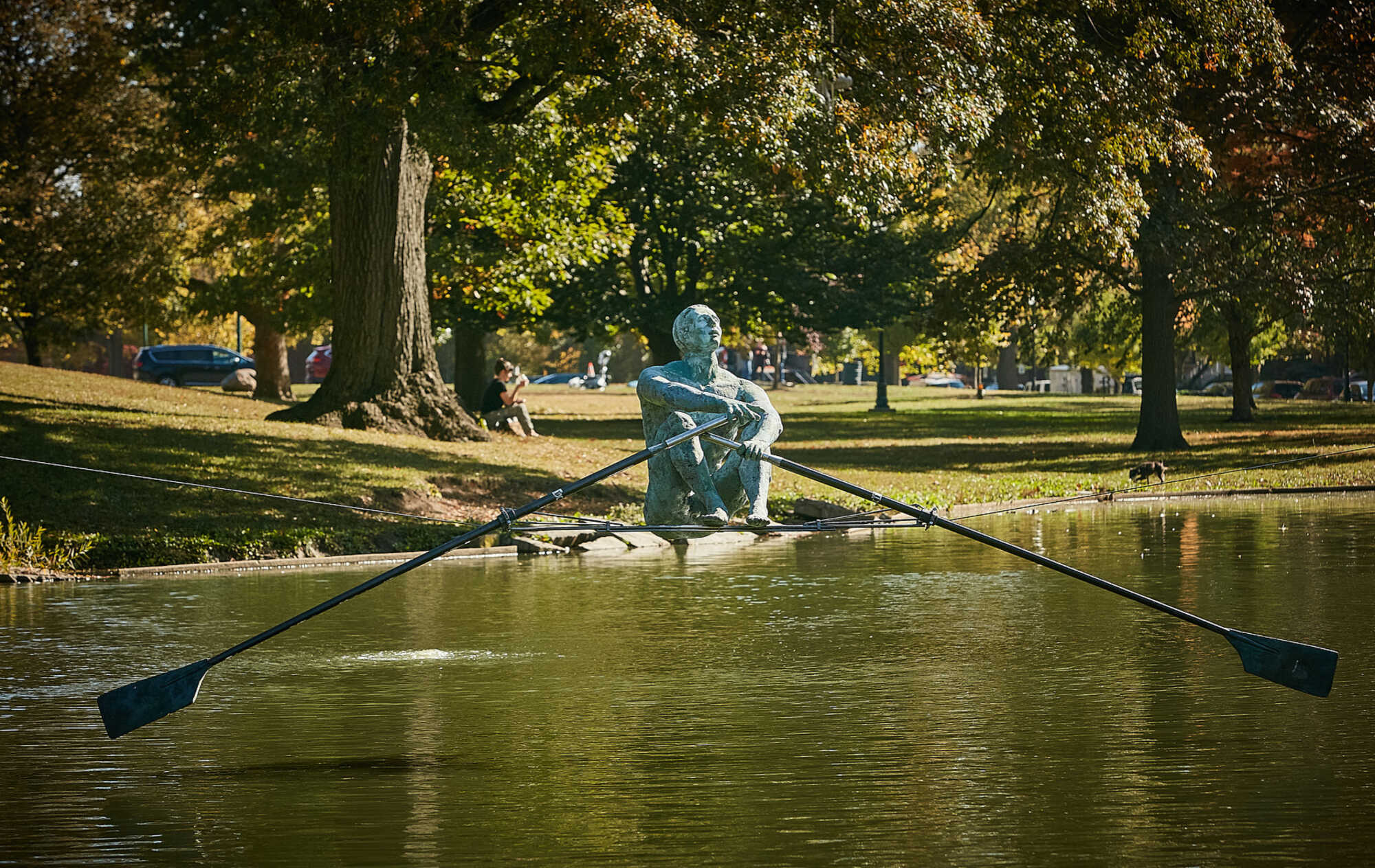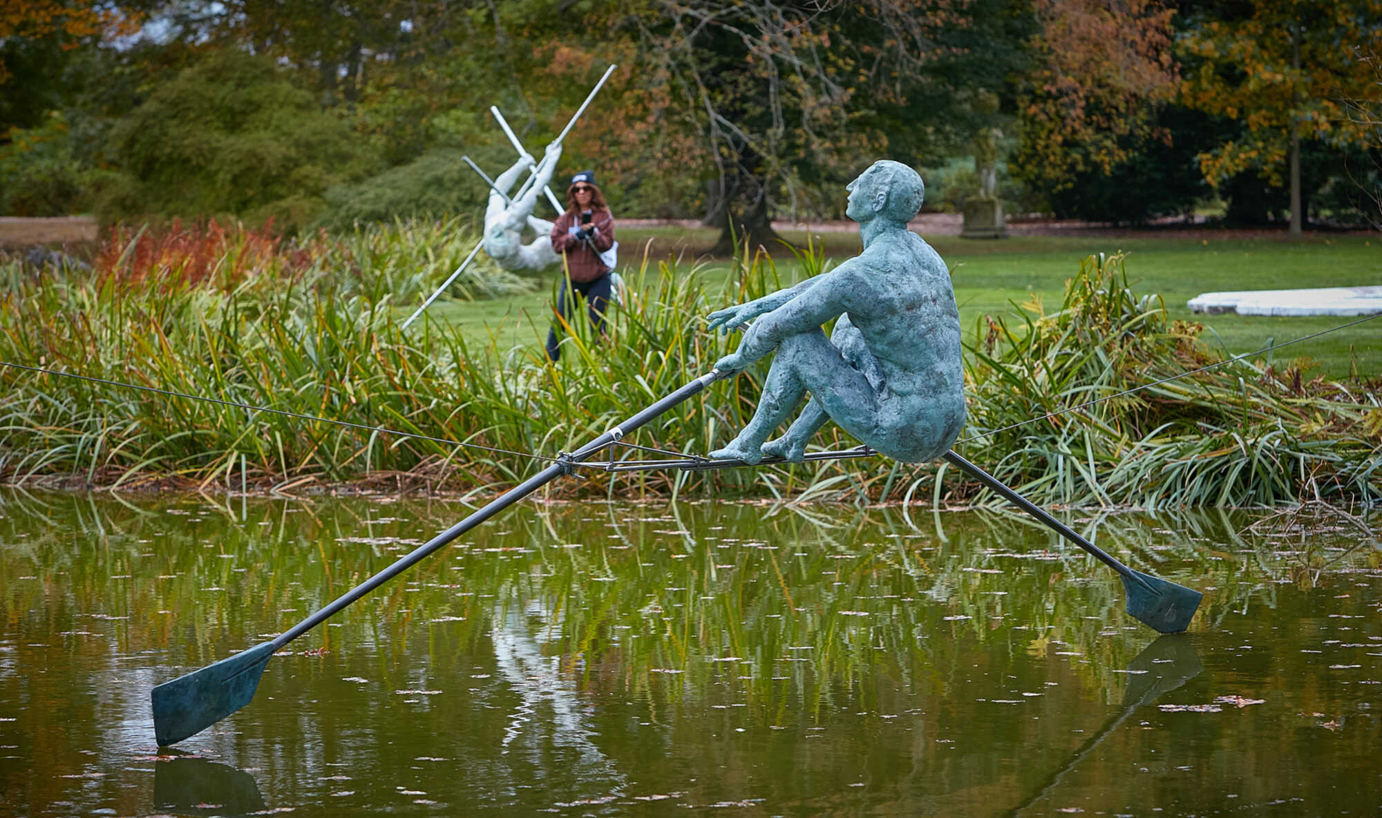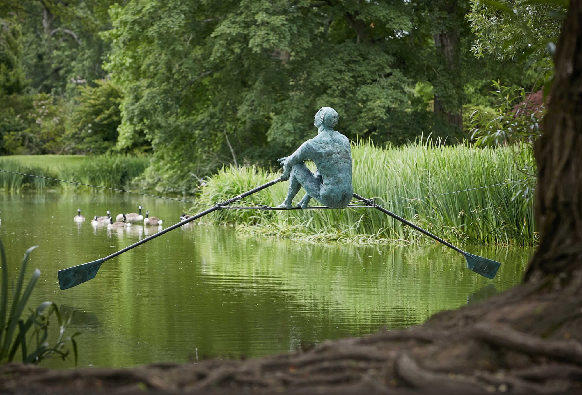Balancing sculpture, proprietary synthetic composite, steel, ca. 240x120x110 cm + 2 x paddles 375x10x25 cm