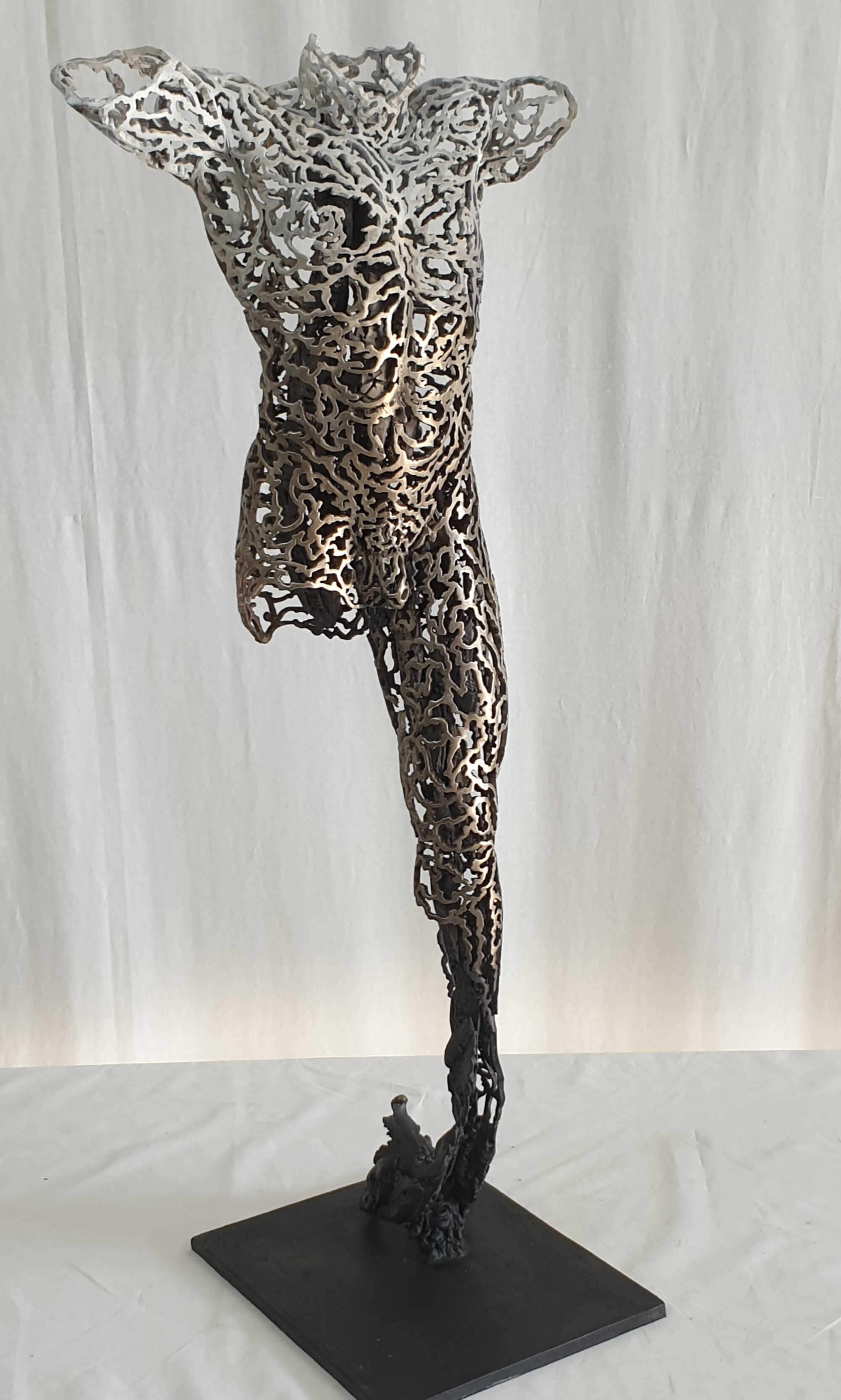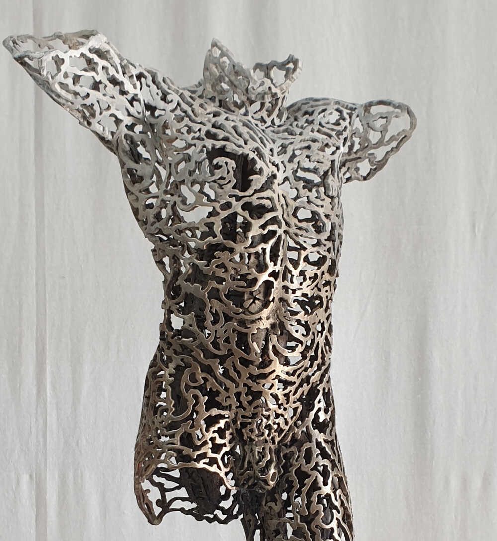 Their 1/4 life-size, partial figures materialize before us. Both seductive and tragic, their perfect proportions reflect the hidden perspectives of our human condition. The textured exterior surface alludes to the complexity of our individuality. The open, exposed interior elicits introspection. Holding fast to thei