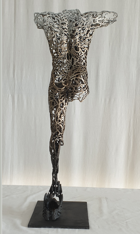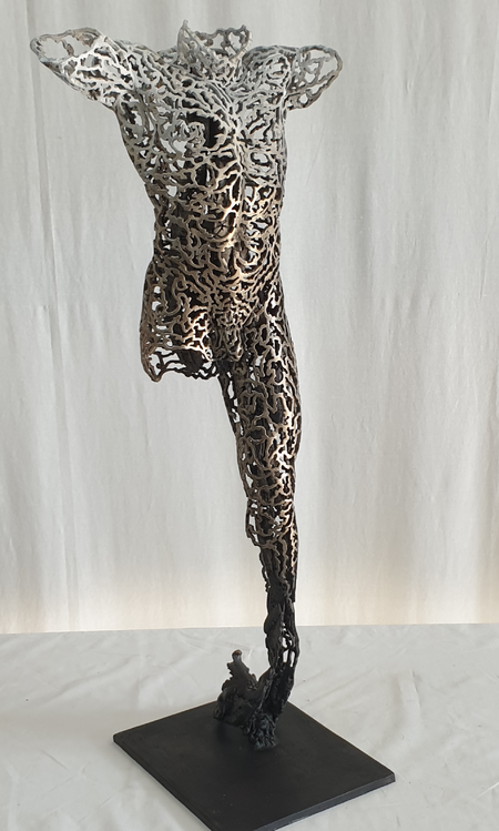 Participating in the evolution of figurative sculpture, the latest work; Andromeda Collection, entails partial figures created digitally and 3D printed, then cast in bronze. These continue the artists commentaries on our human condition.