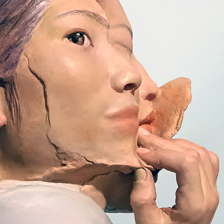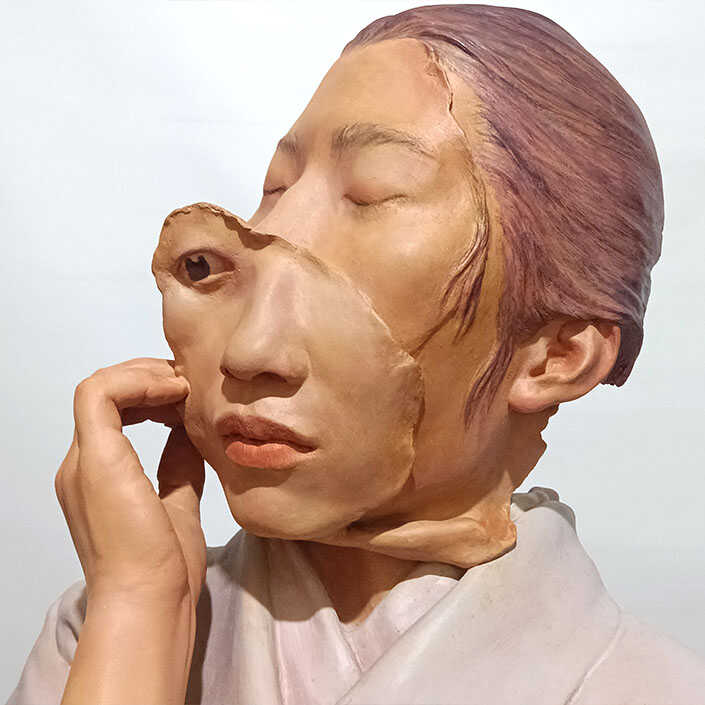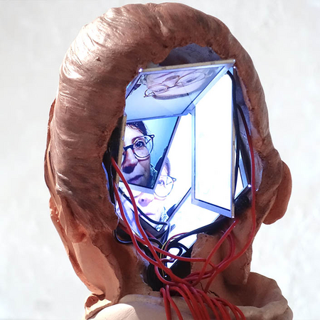 Modeled sharpening and blurring, facial fragments flowing over and into one another, are subtracted from the protagonist. The open back of the head was filled with video projections of the respective viewers by the video artist MARCK and symbolizes the influence of our own and external projections on our ego.