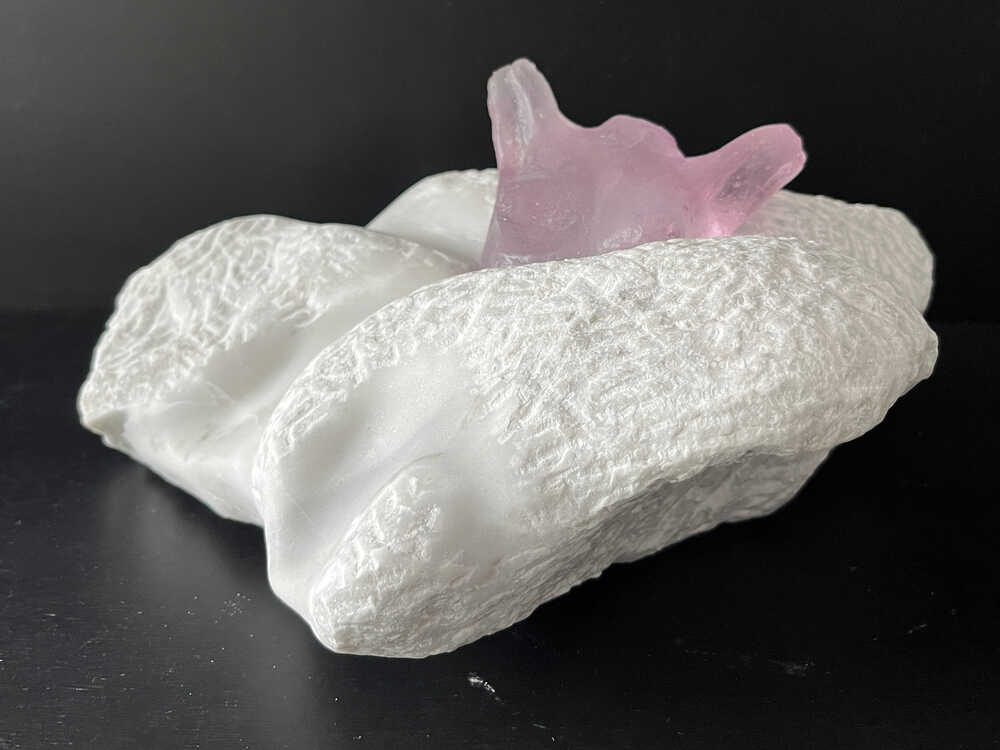 From the hard, rough stone rises a glass form: fragile, but luminous.