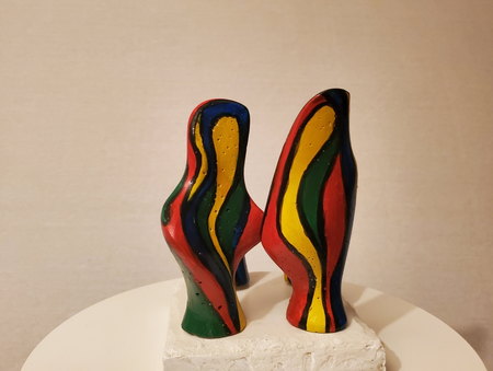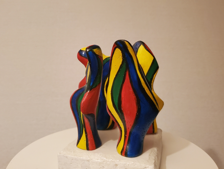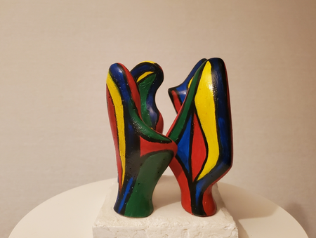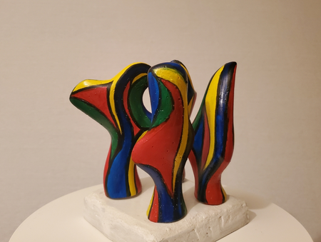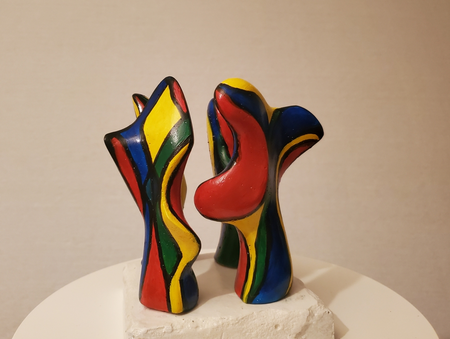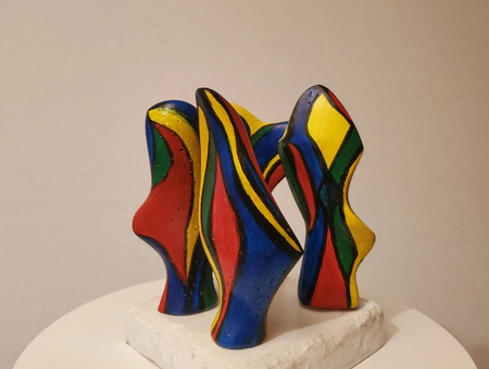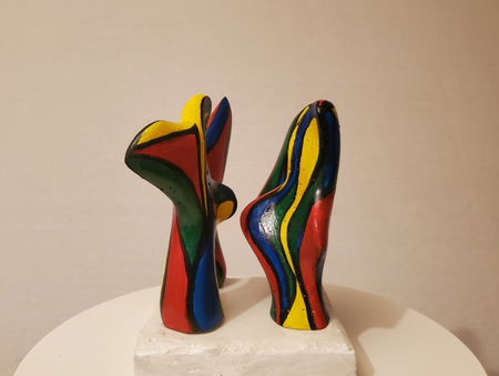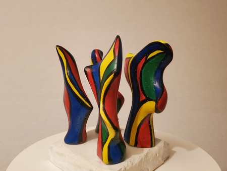 four small coloured mortar figures on a concrete base. By turning the figures separately you see different patterns of interaction.