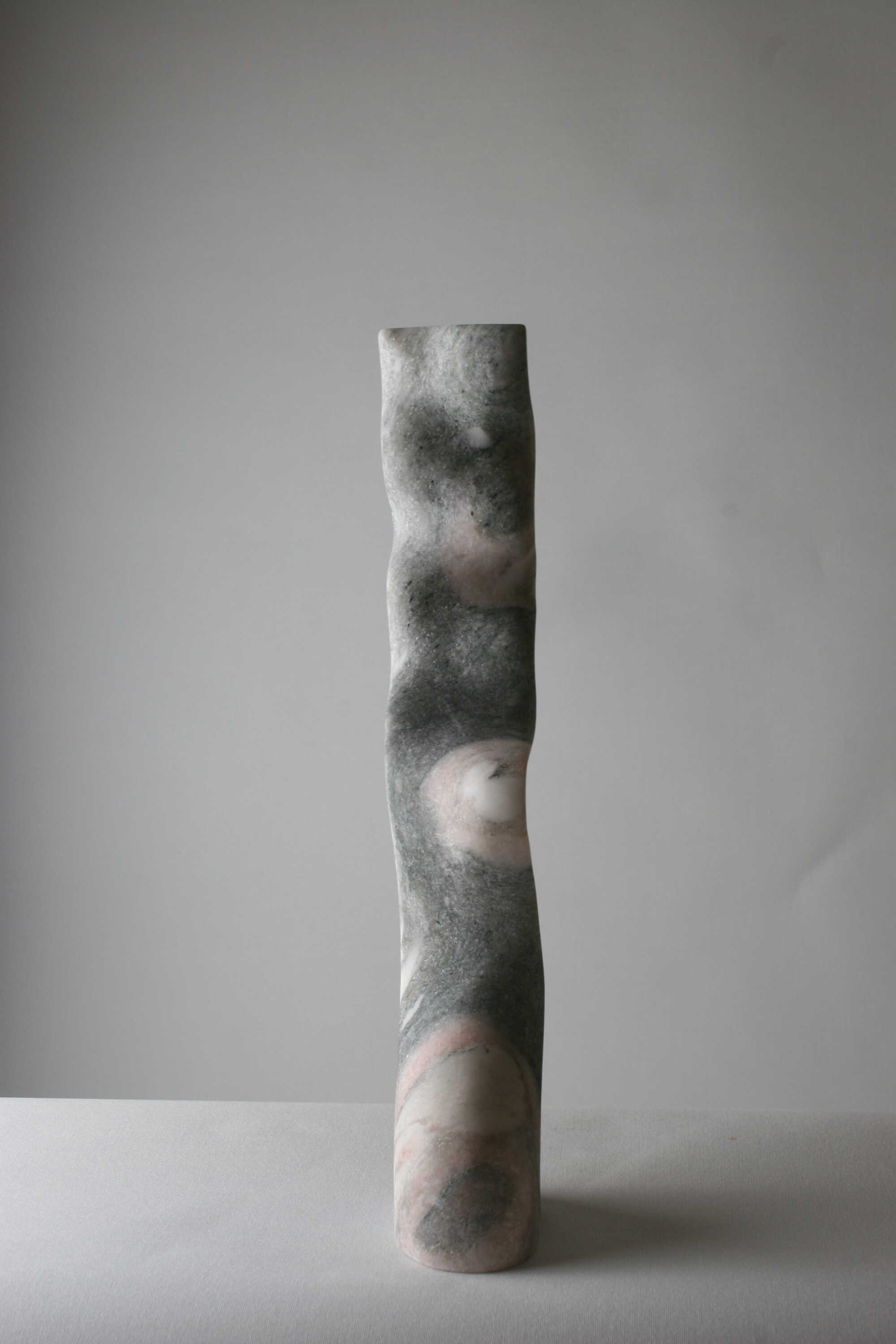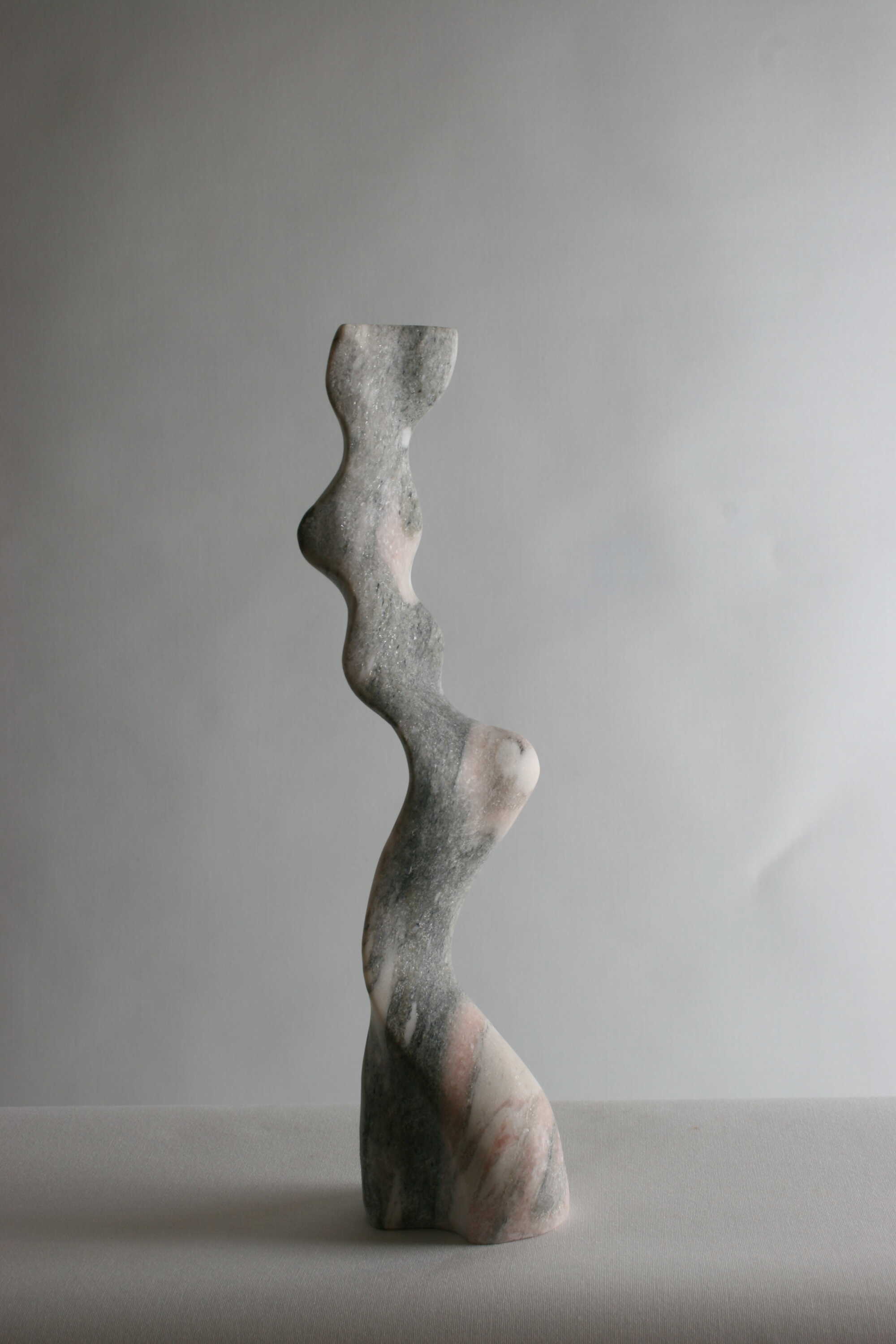 Your sculpture captures your theme â âThe Material and the Vibrationâ â with impressive clarity. You elicit movement from a decidedly static medium: the natural grain of the black marble reads like frequency lines moving along the winding S-curve, transforming mass into rhythm. Compositionally, the vertical swing and measured constrictions create a visual impulse that the eye follows upwards, while the grounded base stabilises the energy. Conceptually, the work maintains a tension between abstract flow and a subliminal figural presence, inviting the viewer to feel vibrations rather than just see forms. The execution is outstanding: the transitions are precise, the polish reveals depth without glare, and the delicate cantilever at the top demonstrates masterful control over weight and balance. The restrained photographic presentat