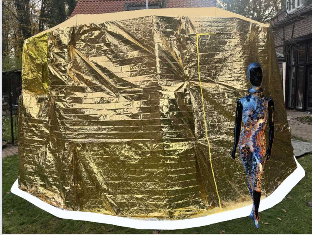 Project for the walk-in coffee capsule (yet to be built): outer skin: original emergency blankets, inner skin: black fabric, interior: 5 magical wall capsule trees, magically illuminated, magical forest scent, magical forest sounds