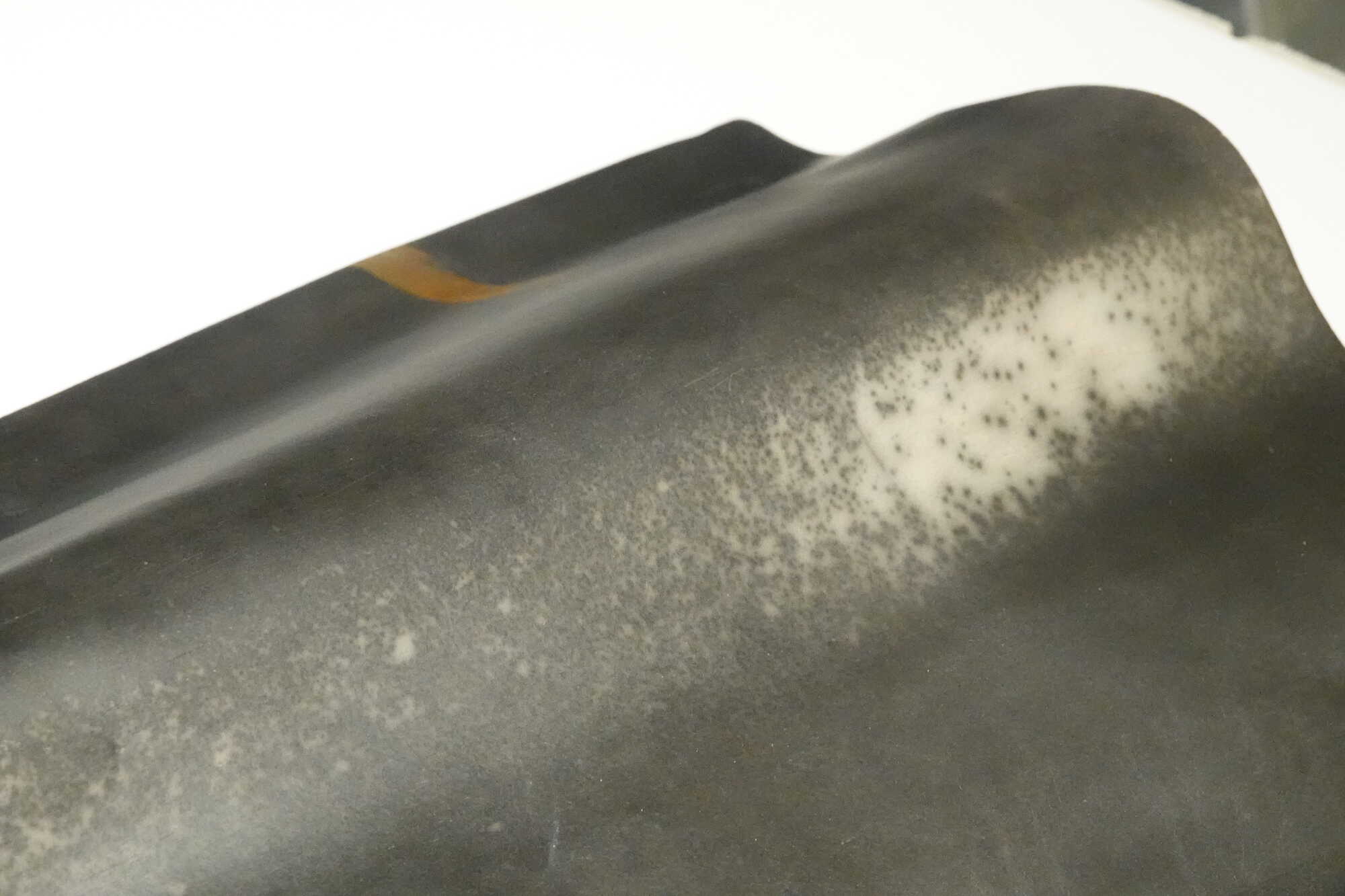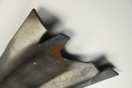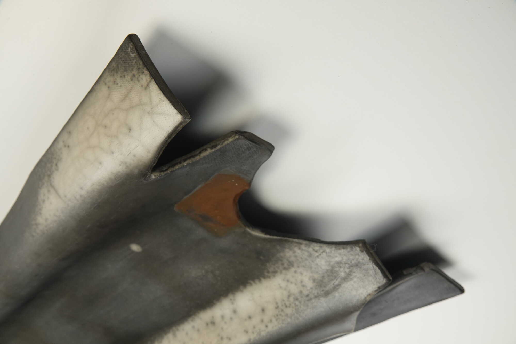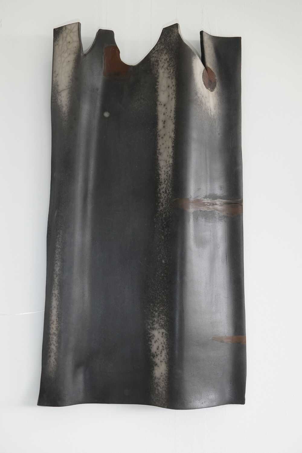 Ein leichtes, elegantes Wandobjekt mit besonderer Ausstrahlung. Geheimnisvolle, zarte Lichtstreifen überziehen das Objekt. Kupferfarbene Bereiche gehen hierzu in Resonanz. Keramik, Naked Raku, mit Aufhängesystem.