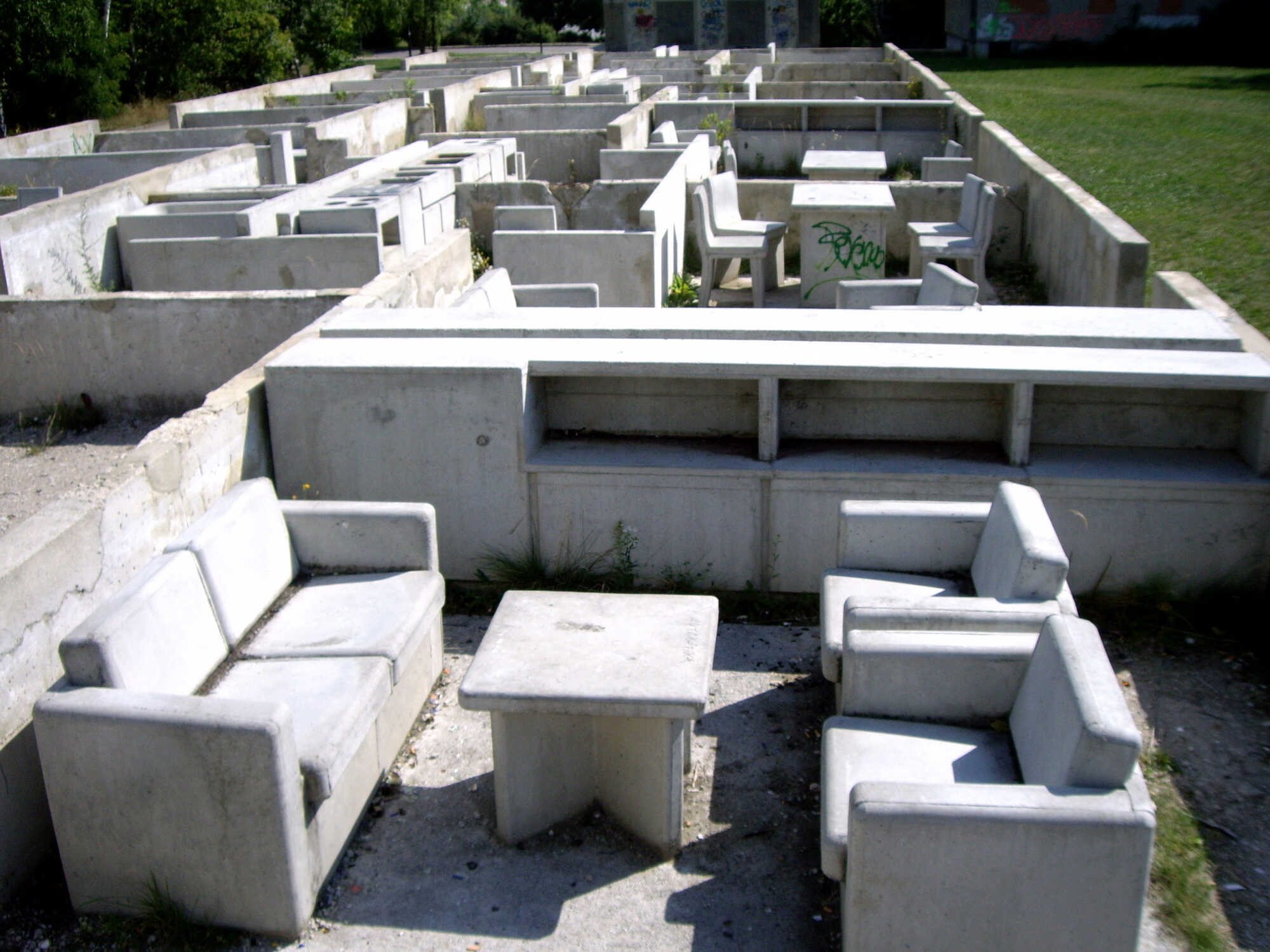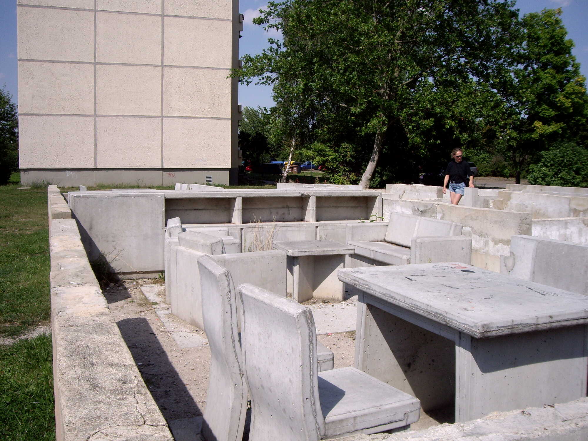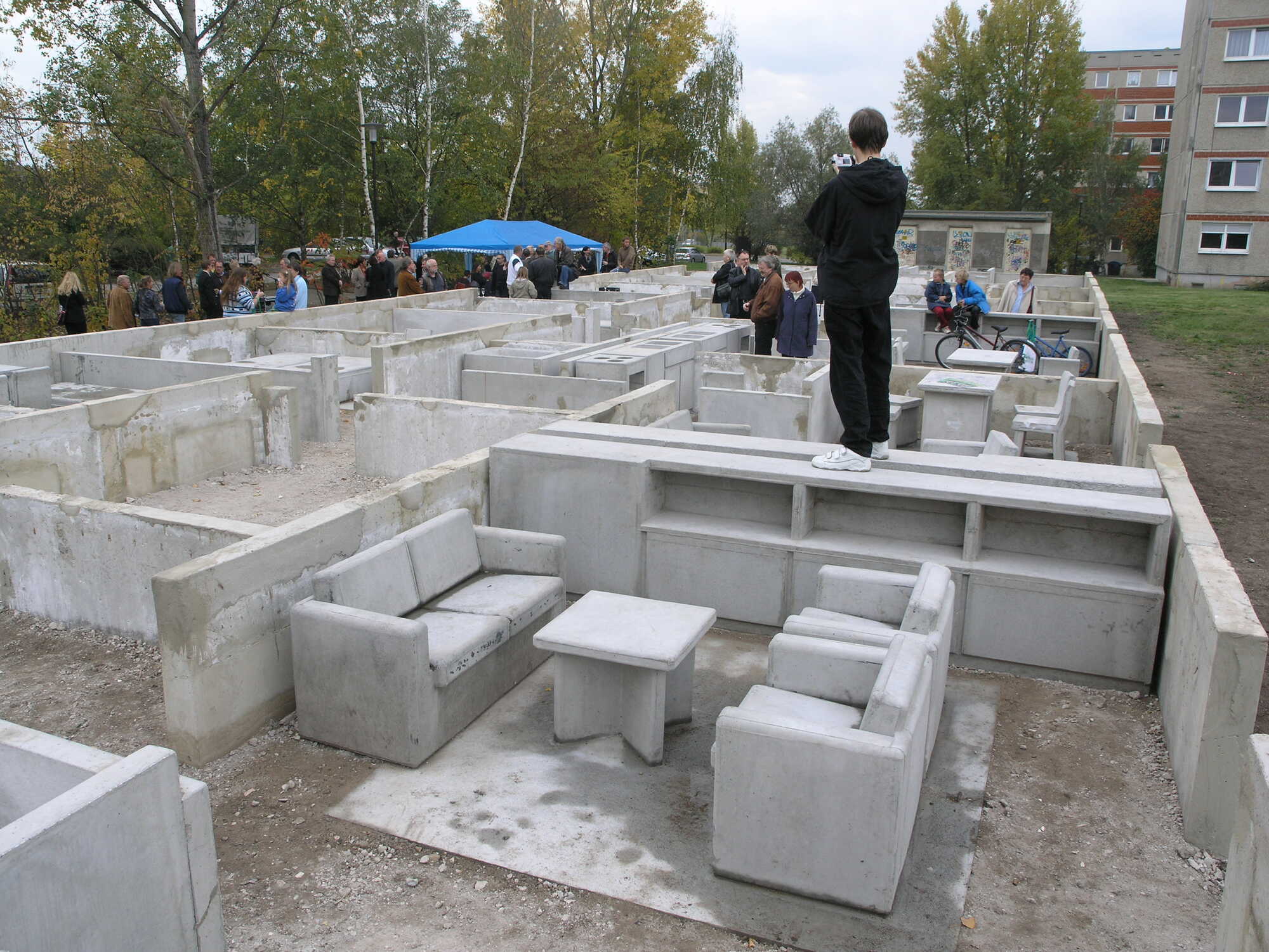 However, three entrances in Silberhöhe still have a future within the context of the artistic symposium "Trace of Stones": on Erich-Kästner-Strasse, six apartments are preserved as ground-level sculptures in the open air. From above, one can look down into a typical apartment floor, much like into the often-reconstructed floor plans of archaeological excavations. One discovers a living environment that seems to have been preserved as a site of life from just a few decades ago, carefully conserved in concrete. And of course, such an artistic transformation always elevates and elevates the site to a certain degree. The "capital beneath the earth," seemingly revealed through a deliberate act, allows visitors to glimpse how large this now-abandoned housing complex once was; or how small the living spaces of the typical family of four actually were back then.