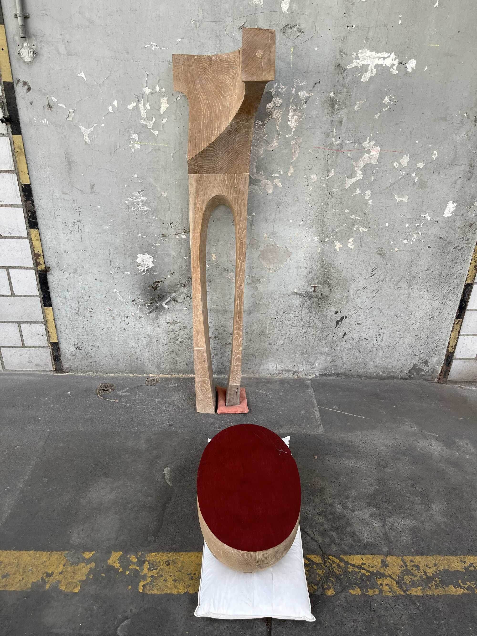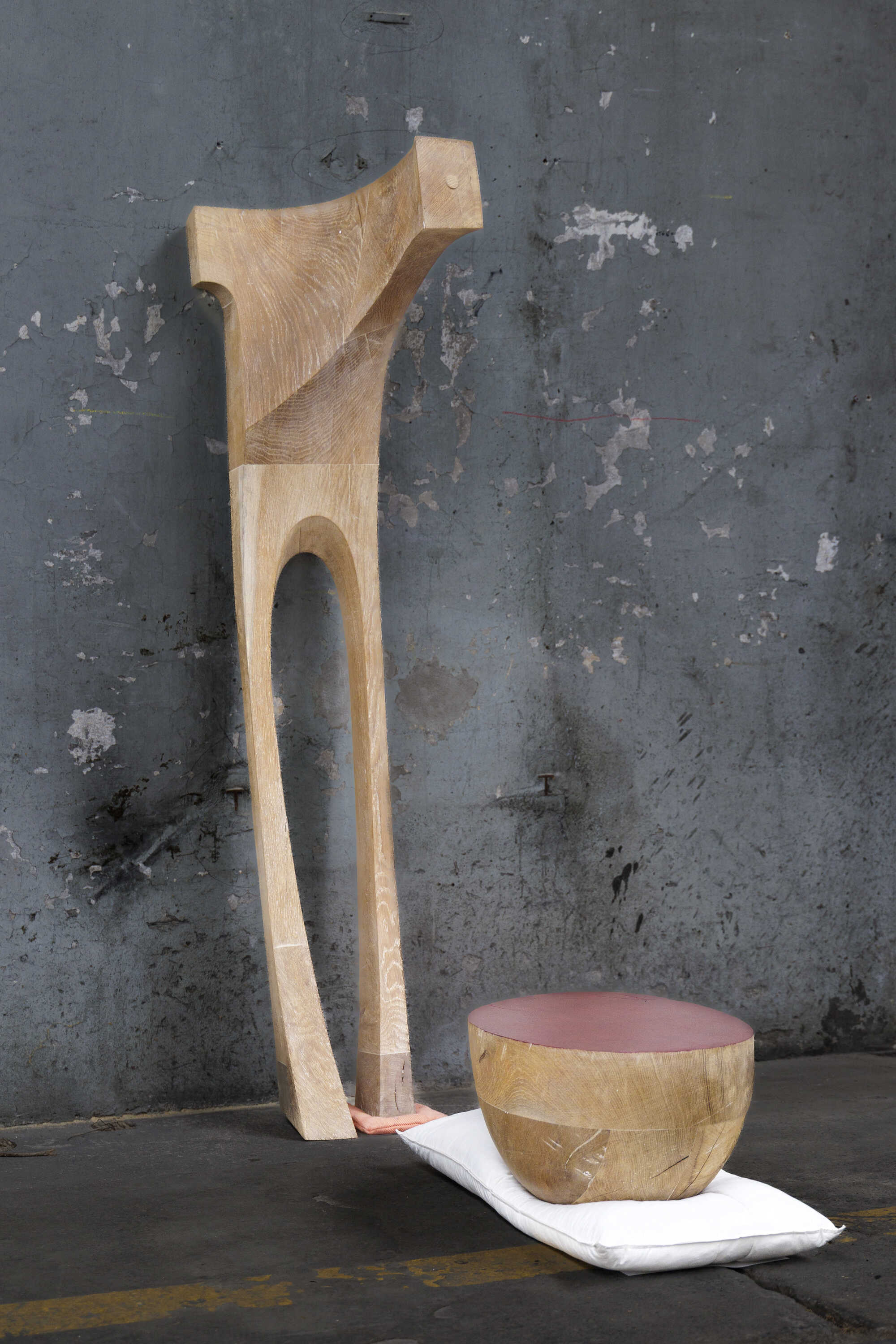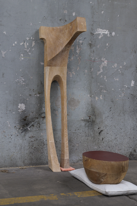 Installation aus Eichenholz-Skulpturen und Kissen.