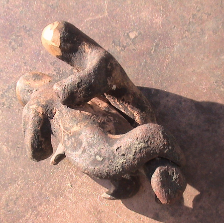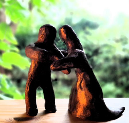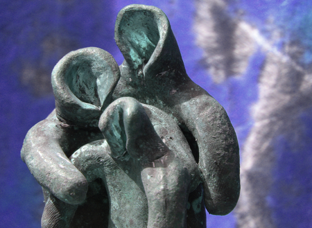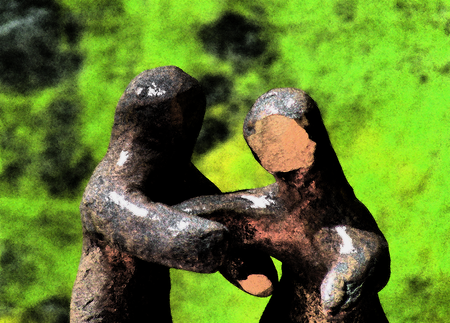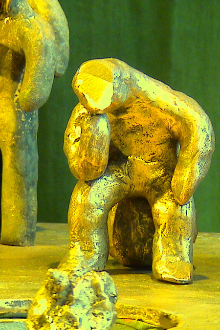 Auf dem Tableau befinden sich verschiedene Personen: Vier Frauen unterschiedlicher Herkunft, eine etwas dicke Türkin, eine magere Protestantin, eine Katholische mit Kopftuch und eine Frau, die sich ungebunden fühlt, reden miteinander. drei Mädchen mit langen Haaren spielen und tanzen, zwei Buben raufen, zwei Männer tun das Gleiche, eine Frau betet, ein Pärchen freut sich aneinander, drei Berater wissen alles besser während ein einsamer Denker nichts versteht. Das Tableau kippt leicht.