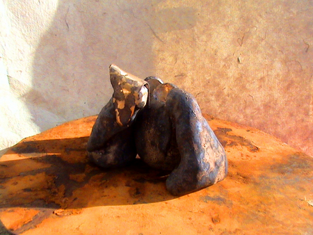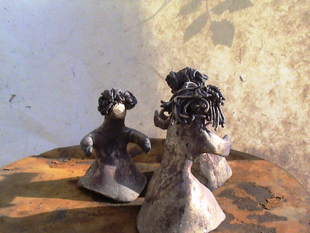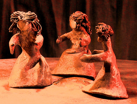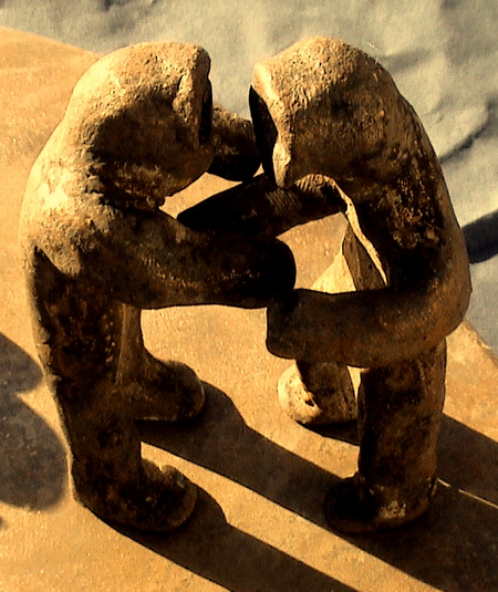 Four women in peaceful talk, next to them girls playing, boys fighting, a couple in love, men arguing, several advisors, a lonely thinker and a woman praying.