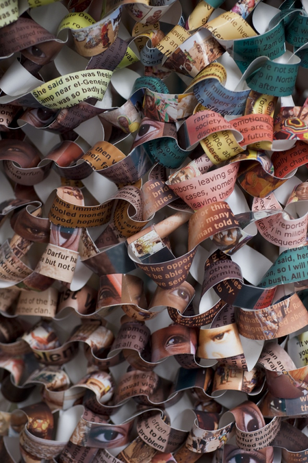 In this artwork I have knitted together images of Darfurian girls and women cultivating farmlands or seeking water and firewood with their traumatic stories of mass rape and violence.