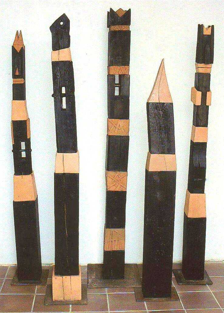 König mit 3 Wächtern und Spitzenstele, Holz/Terrakotta