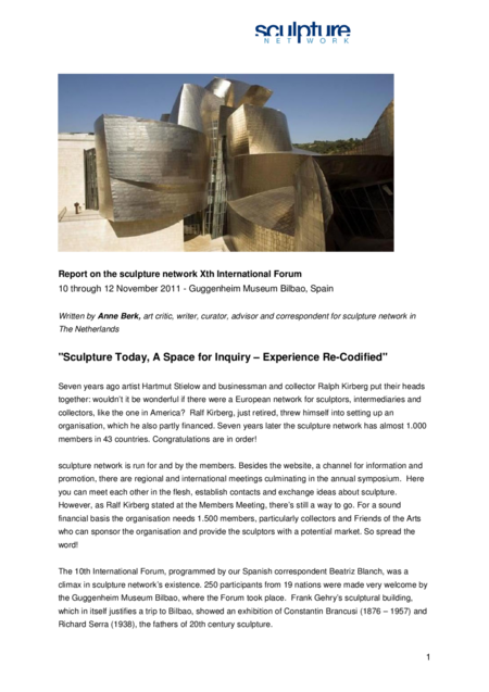The 10th International Forum, programmed by our Spanish correspondent Beatriz Blanch, was a climax in sculpture network's existence. 250 participants from 19 nations were made very welcome by the Guggenheim Museum Bilbao, where the Forum took place. Frank Gehry's sculptural building, which in itself justifies a trip to Bilbao, showed an exhibition of Constantin Brancusi (1876 - 1957) and Richard Serra (1938), the fathers of 20th century sculpture.