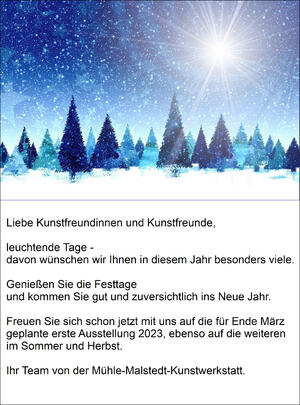 - Veranstaltungsort:Ehemalige Wassermühle. Großes Haus mit 3 Etagen. Galerieräume groß und hell. Parkähnlicher Garten mit Skulpturen. Idylle auf dem Lande!Programm:11.00 Uhr Begrüßung der Gäste11.30 Uhr Internetschaltung mit sculpture networkVortrag und Diskussion zum Thema:"Weniger wäre mehr gewesen!"Die Kunst des Weglassens!Feuer im Garten: Grillen dort oder bei Regen in der Galerie. (Wurst und Brot kann dort gekauft werden)Wer möchte, kann ein kleineres Werk mitbringen und es und sich dort vorstellen.Gespräche zu Punsch und Wein!Kostenbeteiligung : 5,00 €