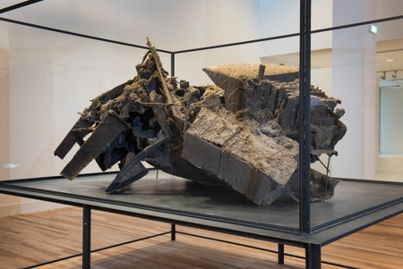 Peter Buggenhout’s unpolished sculptures evoke images of chaos and disorder, of abandoned ruins and archeological findings from a different era. His oeuvre, in which he focuses on the use of abject materials, such as debris, industrial waste, horsehair, blood, intestines and household dust, contains both enormous installations and smaller works that are often presented on pedestals or vitrines.
