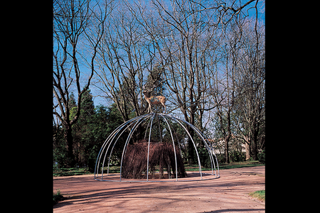 The work of Mario Merz (born 1925 in Milan – deceased 2003 in Milan), a leading figure in Arte Povera, delves into the processes of transformation found in nature and in human life. One of the first artists in Italy to work in the medium of installation, he began in the 1960s to move past the two-dimensionality of a painting by piercing his canvases and objects with neon tubing. In 1968, he introduced what became one of the most recurrent motifs in his work: the igloo, a structure he would continue to explore throughout his career. His igloos, a metaphor for inhabited places and spaces, often have metal frames covered in fragments of materials as varied as clay, glass, stone, jute, and iron.