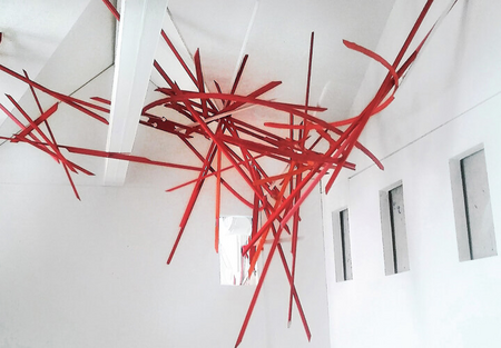 Boris Doempke zeigt im Pavillon des Gerhard-Marcks-Hauses eine raumbezogene Arbeit, die seine Werkreihe »Tales of space« fortschreibt. Dabei gewinnt die den Luftraum einnehmende Installation ihre Form aus den besonderen Eigenschaften der Architektur, welche so zum integralen Bestandteil der »Raumzeichnung« des Künstlers wird. Gerade und gebogene, rot lackierte Leisten verschiedener Länge und unterschiedlichen Querschnitts bilden die Grundlage eines Zusammenspiels von Leichtigkeit, Dynamik, Balance und in den Raum expandierender Farbe. Das komplexe Gefüge sich immer wieder überschneidender Linien und Richtungswerte setzt beim Umschreiten der Arbeit eine virtuelle Motorik ständig wechselnder Bilder in Gang – die schwebende Farbe und ausgreifende Struktur dynamisieren den Raum und das Bildhafte wird unlösbar mit ihm verknüpft.