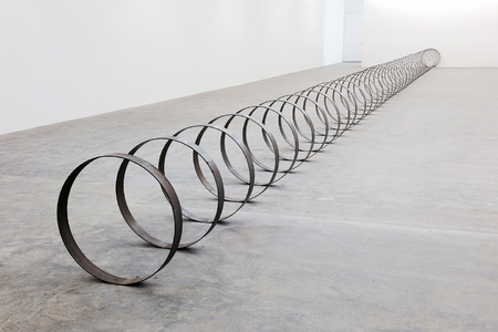 Running along the full length of the ground-floor gallery and extending onto the outside terrace, is Steel Rings, 2013â, comprised of 28 rolled steel rings, each one engraved with a distance in kilometres, a longitude, latitude and the elevation of a specific point along the TAPline pipeline. The Trans-Arabian Pipeline, built in 1947 and once the worldâs largest long-distance oil pipeline, is still the only physical structure that crosses the borders of Saudi Arabia, Jordan, Syria, the Golan, and Lebanon. When the American TAPline company finally closed down after decades of regional conflict, they abandoned the pipeline in situ, where it bears silent witness to that period of history. Although largely untold, this story remains part of human consciousness and memory.